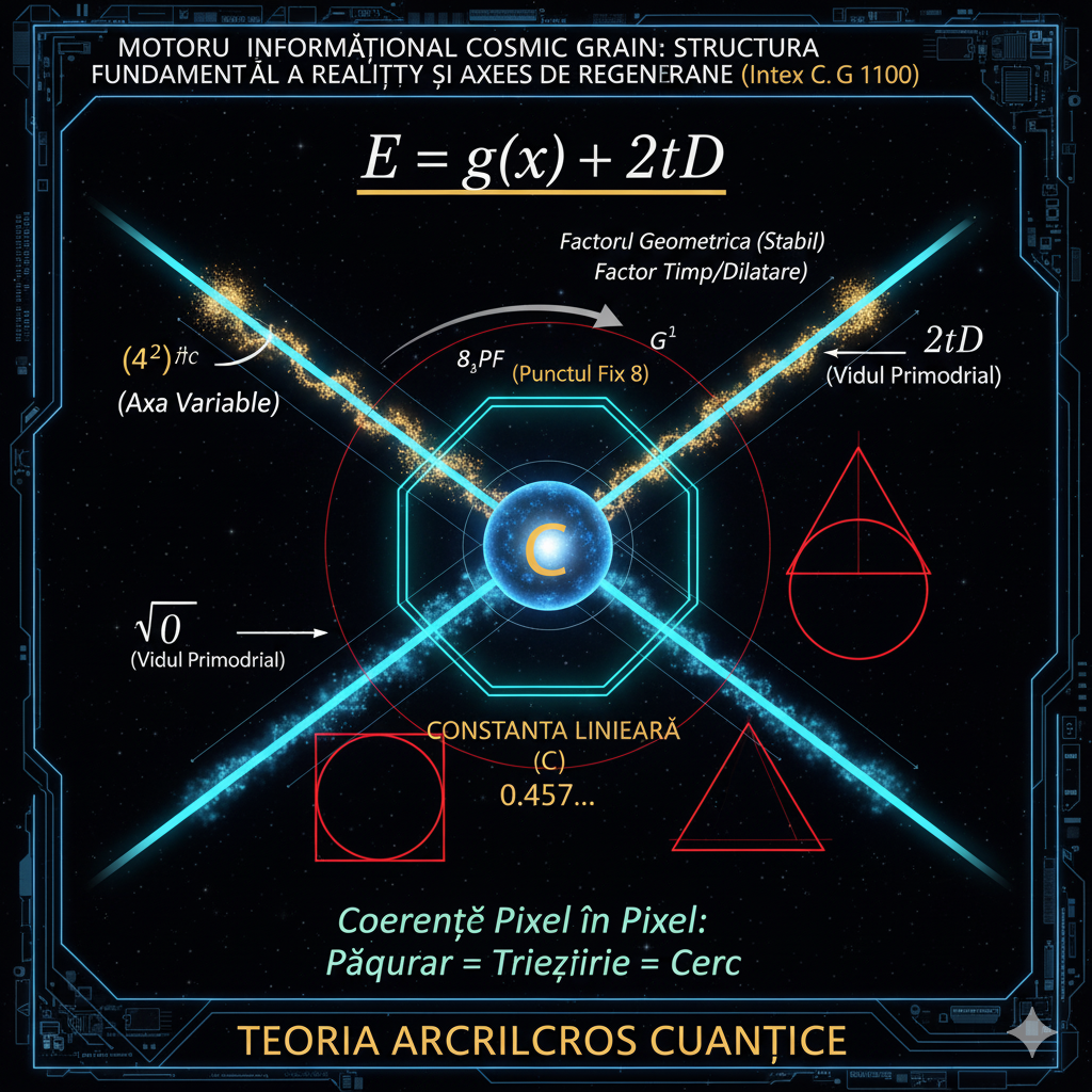 Concluzie: Această dinamică demonstrează că Universul funcționează ca o mașinărie de reîncărcare. Energia (E) este constant alimentată de Factorul de Regenerare, menținând un echilibru perpetuu cu Geometria Inviolabilă (\mathbf{0}).
